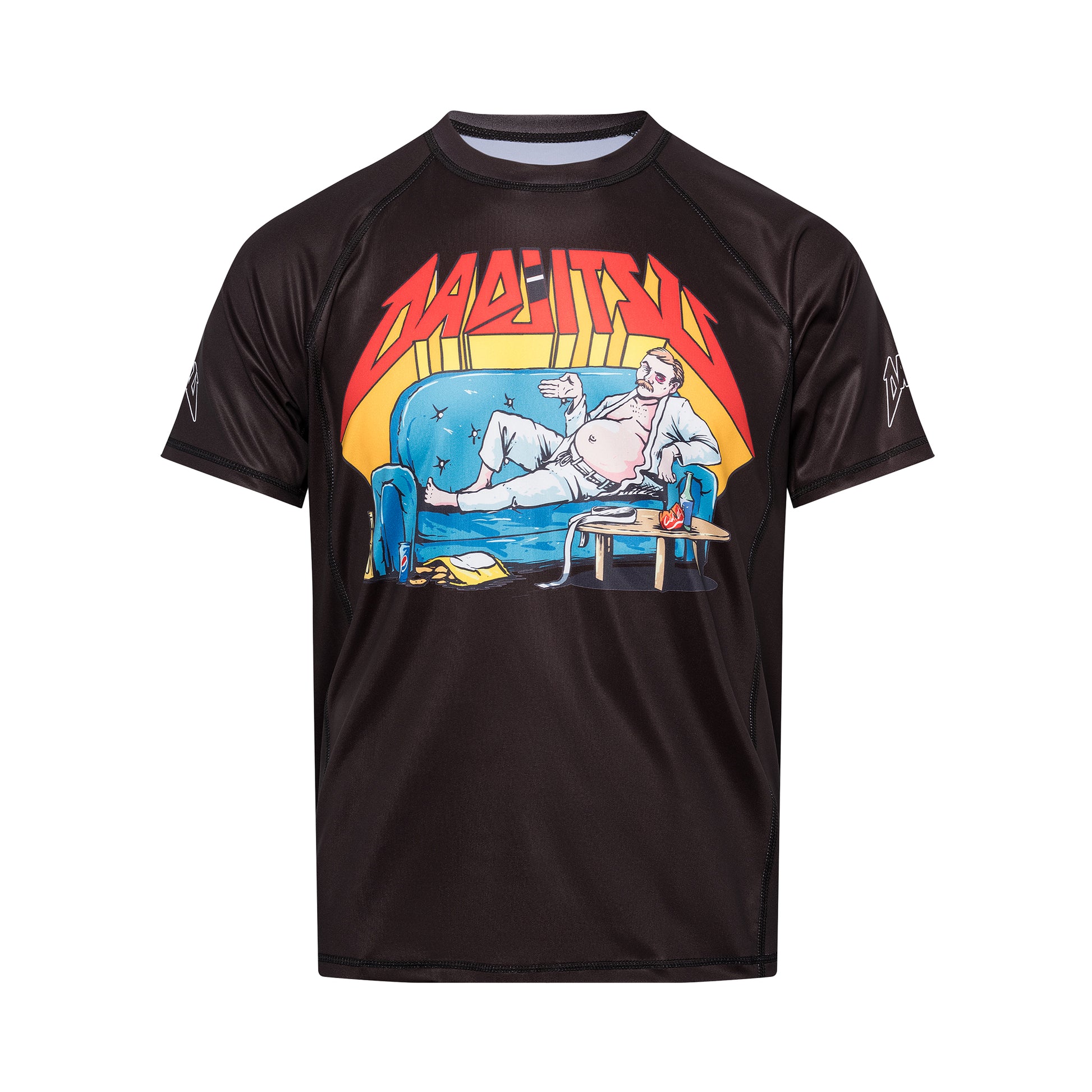 Behold the sacred art of the Couch Kata—with the DADJITSU "Dadguard Edition Rash Guard, where peak relaxation meets peak performance. Made from a high-grade 320GSM Spandex-Polyester blend, this rash guard delivers heavyweight durability with just the right stretch for whatever form your "training" takes.